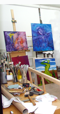 First artistic works: pencil drawings, collages, architectoral art, orientation towards painting, abstract, expressive and surrealistic themes, mostly oil paint on canvas.